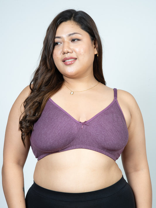 revoue everyday antimicrobial non-padded wirefree pure cotton 3/4th coverage plum purple t-shirt bra and black boyshort panty combo