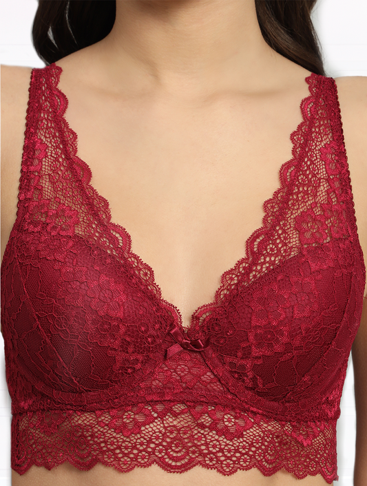 revoue premium burgundy lingerie set (laced double layered padded wired full-cup bralette & low waist bikini panty)