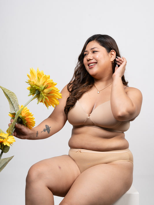 revoue wirefree padded full coverage nude t-shirt bra and beige hipster panty combo
