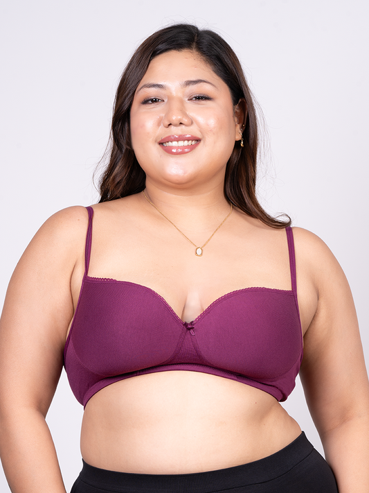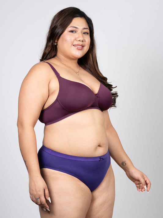 revoue wirefree padded full coverage wine t-shirt bra and purple hipster panty combo